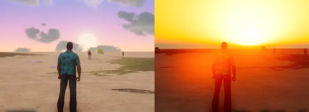 En revanche, les cinématiques originales de GTA Vice City ne peuvent pas être recréées directement sur ce moteur. Elles sont donc intégrées tel quel légèrement retravaillées, (textures HD, fluidité et distance d’affichage uniquement) ce qui permet de maintenir le scénario et les dialogues sans nécessiter de reconstruction complète. C’est en fait une approche hybride. La map et les véhicules sont recréés sur GTA 4 et les dialogues et les cinématiques importés tel quel dans le jeu.