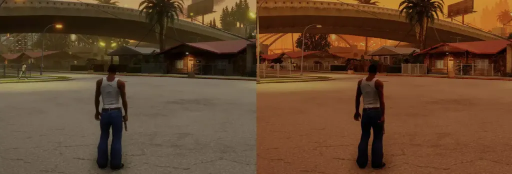 Tous ces soucis de direction artistique viennent en réalité d’une modernisation technique partielle appliquée sur des bases anciennes. Les environnements bénéficient de shaders contemporains, mais les animations, les proportions et certains assets restent figés dans leur conception d’origine. C’est la conséquence de l’utilisation massive d’outils d’upscaling par intelligence artificielle pour les textures. Il s’agit d’une preuve du manque de compétences et de temps pour un projet avec une telle envergure. Remasteriser des jeux aussi complets que GTA et surtout San Andreas ne se fait pas aussi facilement.